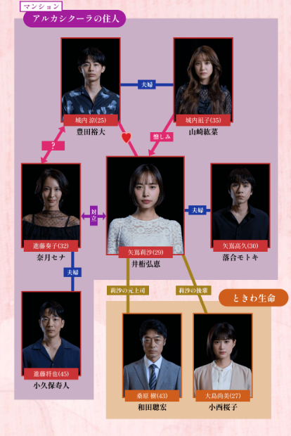 • 矢嶌莉沙(井桁弘恵)…結婚3年目。妊活中であったが夫・高久の不倫疑惑が浮上。